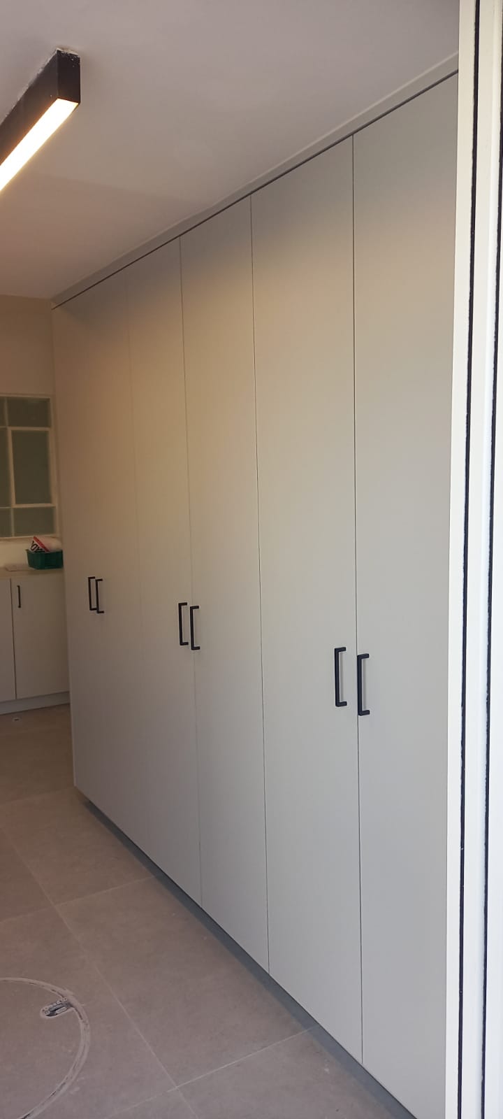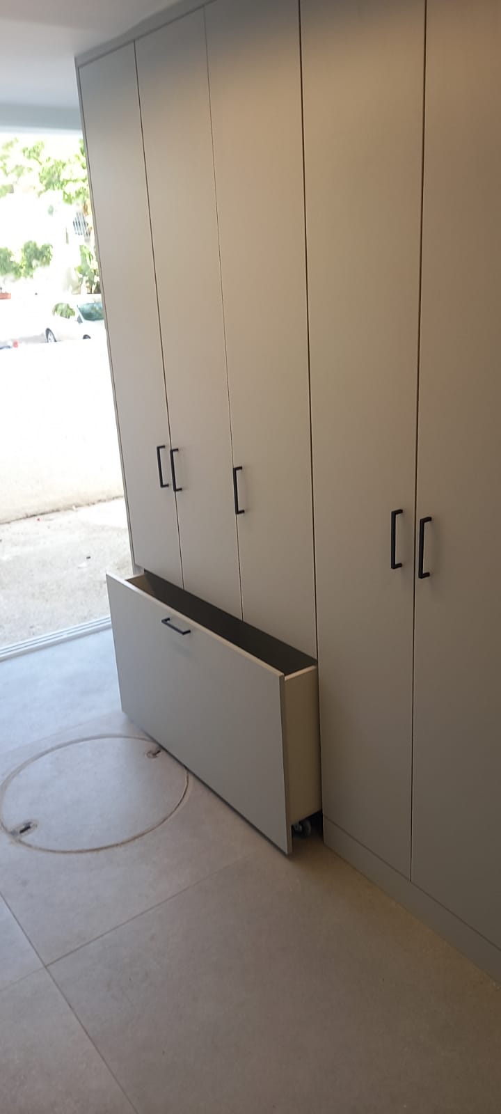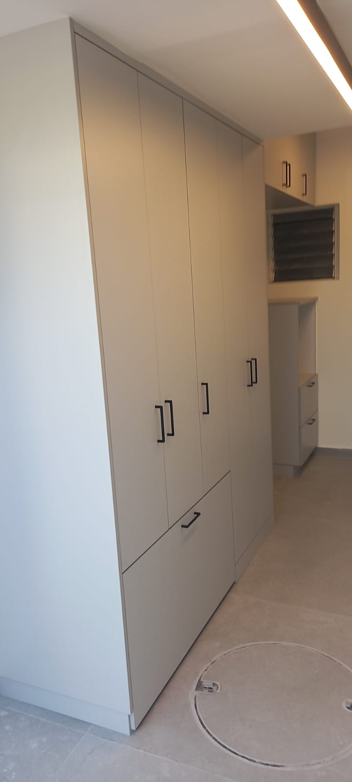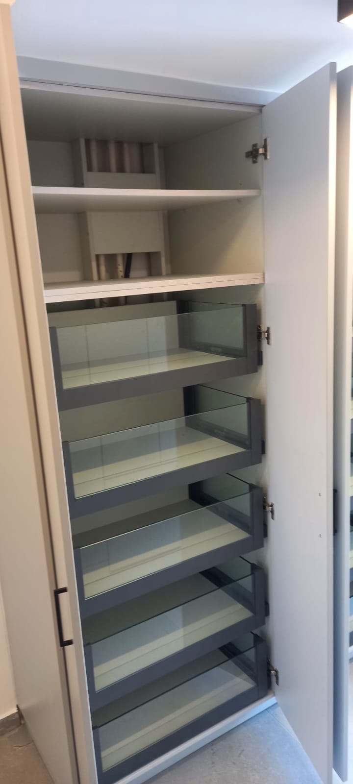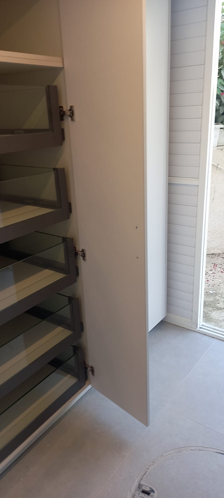 ארון שירות "מזווה" פורמייקה עם פרזול מיוחד מגירות שקופות לנוחות מירבית, מידוף בגבהים ועומקים שונים והסתרה של צינורות תשתית מאחור והכל בהתאמה לחלל לניצול מירבי של השטח תוך התאמה ומענה לכל בקשות הלקוחה.