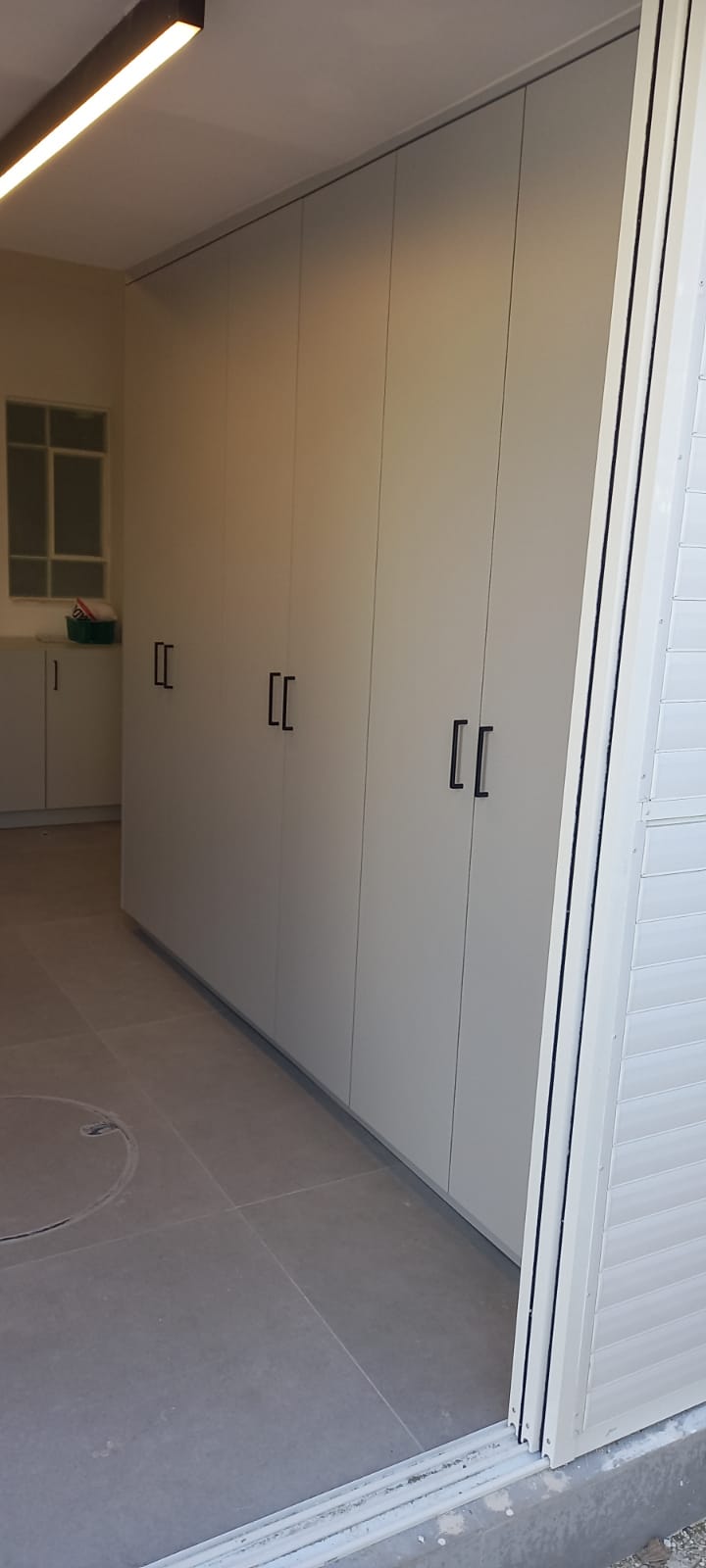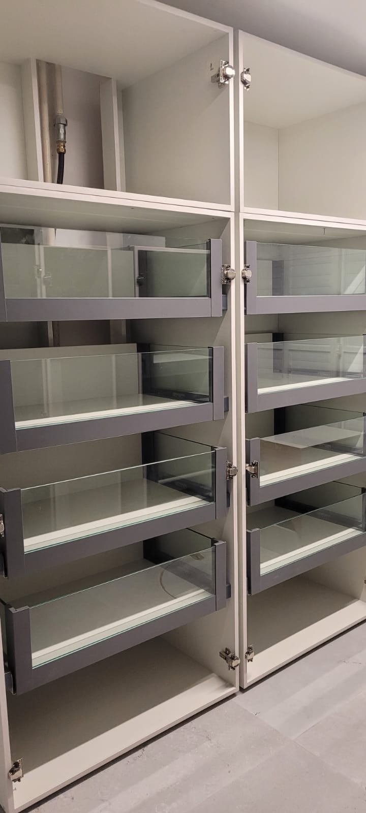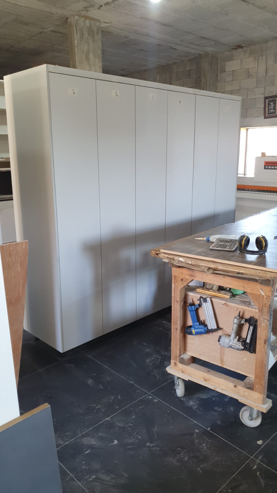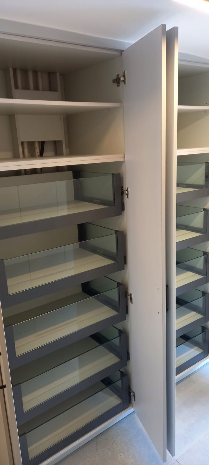 ארון שירות "מזווה" פורמייקה עם פרזול מיוחד מגירות שקופות לנוחות מירבית, מידוף בגבהים ועומקים שונים והסתרה של צינורות תשתית מאחור והכל בהתאמה לחלל לניצול מירבי של השטח תוך התאמה ומענה לכל בקשות הלקוחה.